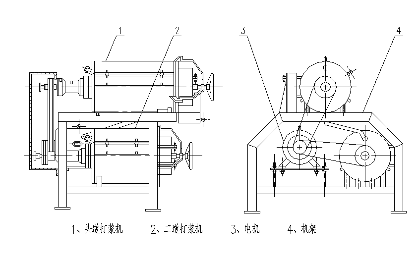 ★ 主要結(jié)構(gòu):傳動系統(tǒng)、軸承座、套軸、筒后蓋、擋漿盤、筒身、花鍵軸、篩網(wǎng)、刮板(或打漿棒)、筒前蓋、機(jī)架等