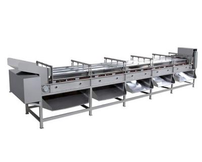滾筒分級機重要部件為傾斜度為3~5°左右裝置的圓筒篩,篩網用不銹鋼板沖孔制成,孔徑由小到大自圓筒篩的高 端向低端擺放。隨圓筒篩的旋轉水果逐級由小到大從篩孔中漏出,特大水果則從圓筒篩結尾滾出。