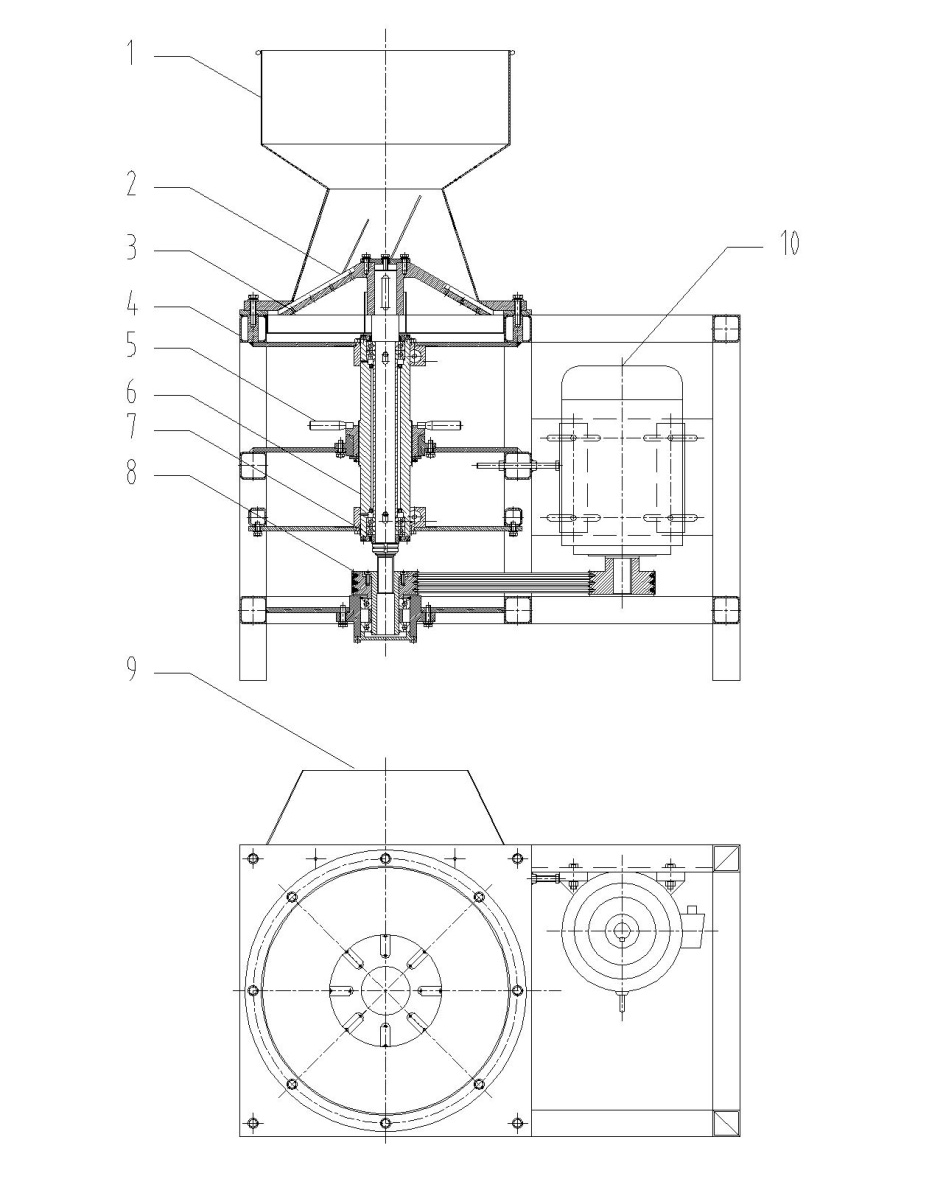 1、進料斗;2、齒刀片;3、刀盤;4、機架;5、轉子升降機構;6、軸承架;7、軸承;8、皮帶傳動機構;9、出料斗;10、電機